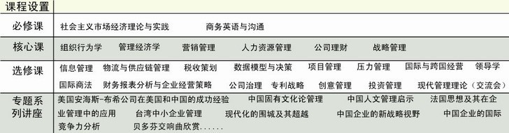 按照国务院学位办的要求,参照国际着名商学院的课程设计方案,采纳与国际同步的最新课程体系,结合中国国情,融入华中科技大学严谨、务实的办学特色。教学实行弹性学制,一般每月集中授课一次,授课与各种体验式学习相结合如案例研讨、名家论坛、主题沙龙、参观考察、沙盘模拟等。