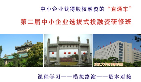 武汉大学深圳研究院培训学院致力于创建中国领先的投融资学院,首创企业投融资"直通车"的概念--课程学习--模拟路演--资本对接。活动的目的是让学员企业参加武汉大学倾力打造的有全国十家着名资本机构(名单附后)参加的"对接会".切实提高企业对资本市场的理解、提升参与资本市场运作的能力,提高投融资的成效。