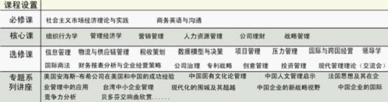 按照国务院学位办的要求,参照国际著名商学院的课程设计方案,采纳与国际同步的最新课程设置体系,结合中国国情,融入我校办学特色,开设了如下的课程。