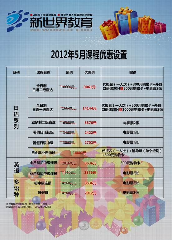 课程名称: 新世界2017年5月课程优惠活动