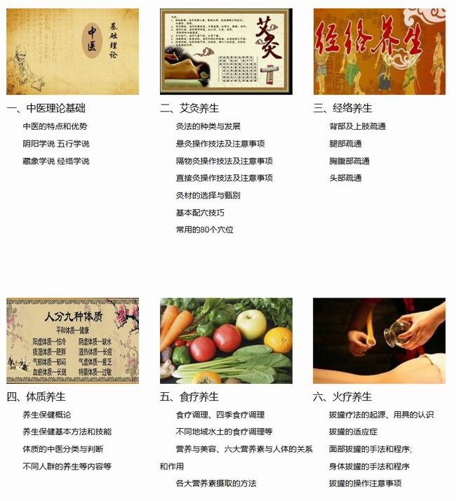 中医基础理论、艾灸养生、经络养生、体质养生、面诊、五行理疗等保健治疗项目,主要是利用面诊、手诊、听诊器等检测身体健康情况,再通过体质、经络、五行、脏腑、食疗等调理改善亚健康症状