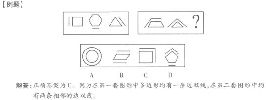 解答:正确答案为C。因为在第一套图形中多边形均有一条边双线,在第二套图形中均有二条相邻的边双线。