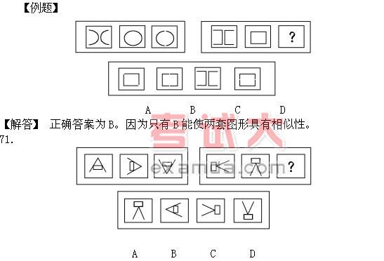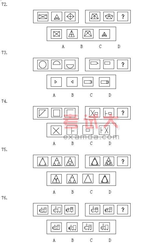 每一道题给出两套图形,左套中的三个图形在构成上,或变化上,具有某种特点或遵循某种规则。要求从下面四个选项中,选择一个取代右套中的“?”,使右套图形也具有与左套图形相同或相似的构成特点或变化规则。