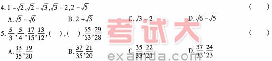 (二)数字推理 下面的每一道试题都是按某种规律排列的一列数,但其中缺少一项或两项,请仔细观察数列的排列规律,然后从四个选项中选出一个最合理的答案来填补空缺。