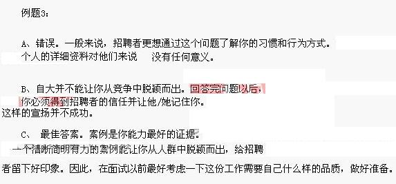 C、 错误。具体案例可以更简单有力地说明你的能力。在解释的时候,人们往往会跑题,夹杂不清。同时,最好不要用“应聘指南”之类的“经典”套话,那会让你像个“职业”应聘的。