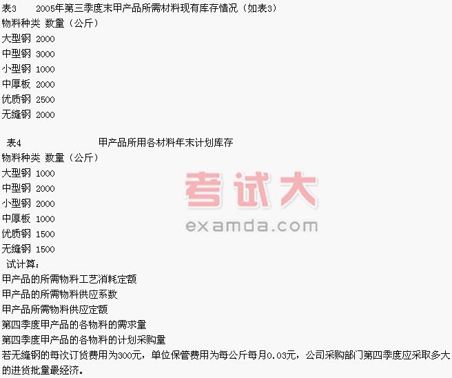 某机械制造公司计划2005年第四季度生产甲产品600台,根据工艺部门提供的资料,已知构成甲产品(零件)耗用各材料的净重及单位产品所必需的工艺损耗情况(如表1)。另据生产供应部门的统计报告,已知2005年前3季度制造单位甲产品各有关材料非工艺损耗情况(如表2)与2005年第三季度末甲产品所需材料库存情况(如表3),为保证2006年持续安全生产,公司物料仓储部门也计划甲产品所用各材料在年末保持适当的期末库存(如表4)。