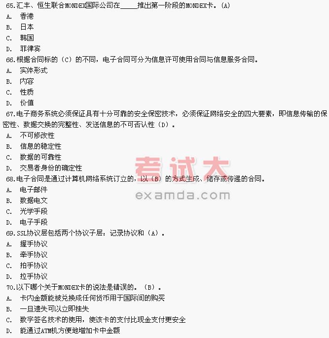 64.电子钱包(E-wallet)是一个在SET交易中运行在银行卡持卡人端的软件(D)。