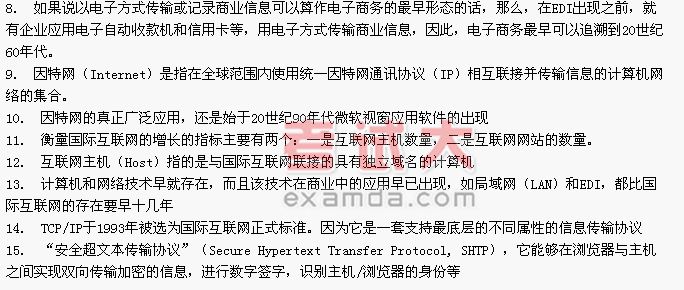 2. "电子商务",具体而言就是通过电子信息技术、网啊络互联技术和现代通讯技术,使得交易涉及的各方当事人借助电子方式联系,而无需依靠纸面文件、单据的传输,从而实现整个交易过程的电子化