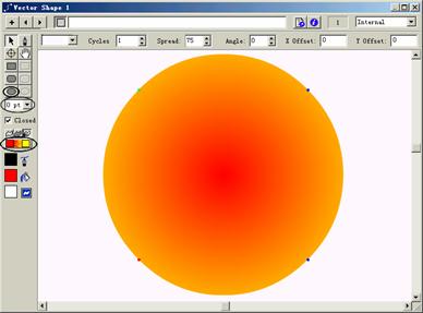 (2) 按Shift+Ctrl+V组合键打开Vector Shape窗口,在工具面板渐变颜色工具栏中,设置前景色为红色,目标色为黄色,设置笔线宽度为0 pt。使用填充椭圆(Filled Ellipse)工具,按住Shift键,在窗口中创建一个较大的圆形,并做自定义设置,如图8-30所示。