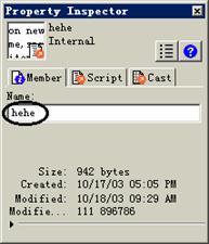 (8) 打开Property Inspector对话框的Member选项卡,在Movie脚本的Name文本框中输入“hehe”名称,如图8-36所示。